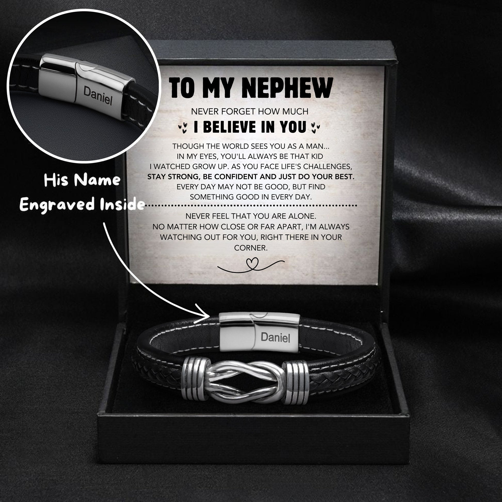 This gift set includes the Infinity Knot Bracelet, symbolizing strength and connection, with an option for personalized engraving. It also comes with a meaningful message card, all beautifully packaged in a premium gift box, perfect for showing your nephew how much he means to you.